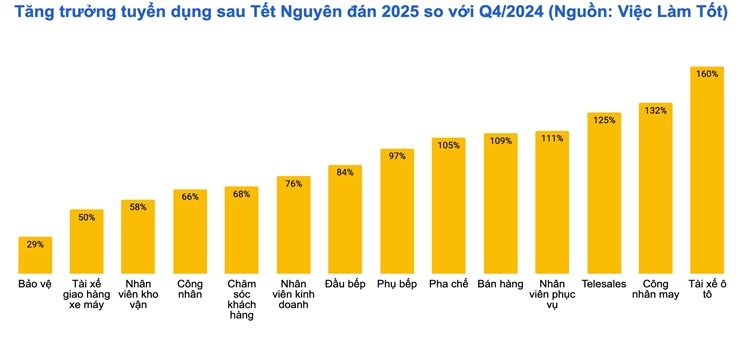 Sau kỳ nghỉ Tết Nguyên Đán, thị trường lao động tại TP.HCM trở nên sôi động hơn bao giờ hết. Nhu cầu tuyển dụng không chỉ tăng mạnh nhằm bù đắp lượng lao động nghỉ việc mà còn phản ánh sự phục hồi tích cực của nền kinh tế. Theo dữ liệu từ Việc Làm Tốt, sau Tết 2025, nhu cầu tuyển dụng tăng 80% so với trung bình quý 4/2024 và cao hơn 14% so với cùng kỳ năm trước. Các ngành có nhu cầu nhân sự lớn bao gồm bán hàng, dịch vụ khách hàng, vận hành sản xuất, thương mại – dịch vụ và logistics. Đáng chú ý, các vị trí như tài xế ô tô, công nhân may, nhân viên kinh doanh, telesales và nhân viên phục vụ nhà hàng ghi nhận mức tăng mạnh nhất, từ 76% đến 160%.