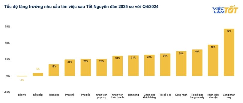 Bên cạnh sự khởi sắc của thị trường, không ít doanh nghiệp vẫn đối mặt với bài toán khó khi tìm kiếm và giữ chân nhân sự. Sau Tết, tỷ lệ nghỉ việc và chuyển việc gia tăng đáng kể, buộc doanh nghiệp phải nhanh chóng tuyển dụng để ổn định hoạt động sản xuất kinh doanh. Ở chiều ngược lại, người lao động cũng tích cực tìm kiếm cơ hội việc làm mới, số lượng người tìm việc trong các ngành chiến lược tăng trưởng 120% so với trước Tết và cao hơn 30-40% so với quý 4/2024. Những ngành có nhu cầu tìm việc cao nhất gồm sản xuất, logistics, thương mại và dịch vụ khách hàng.
