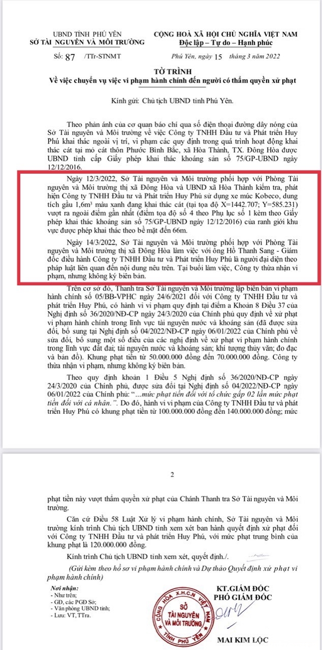 Ngày 15/3/2022, Sở TNMT có Tờ trình số 87/TTr-STNMT về việc chuyển vụ việc vi phạm hành chính đến UBND tỉnh Phú Yên và đề xuất mức xử phạt 120 triệu đồng cho hành vi khai thác trái phép… thể hiện doanh nghiệp này chống đối và không ký vào biên bản làm viêc.