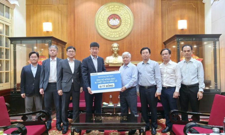 Hưởng ứng lời kêu gọi của Đoàn Chủ tịch Ủy ban Trung ương MTTQ Việt Nam, ngày 14/10, Samsung Việt Nam đã ủng hộ số tiền 10 tỷ đồng hỗ trợ người dân các tỉnh khắc phục hậu quả do mưa lũ gây ra. Trong đó, 5 tỷ đồng sẽ được chuyển tới Ủy ban Trung ương MTTQ Việt Nam để phân bổ cho các tỉnh, thành phố và số tiền còn lại, Samsung sẽ trao trực tiếp cho Ủy ban MTTQ Việt Nam tỉnh Bắc Ninh và Thái Nguyên, mỗi đơn vị 2,5 tỷ đồng.