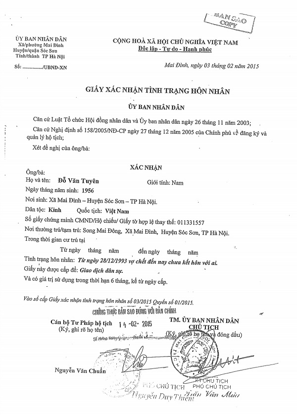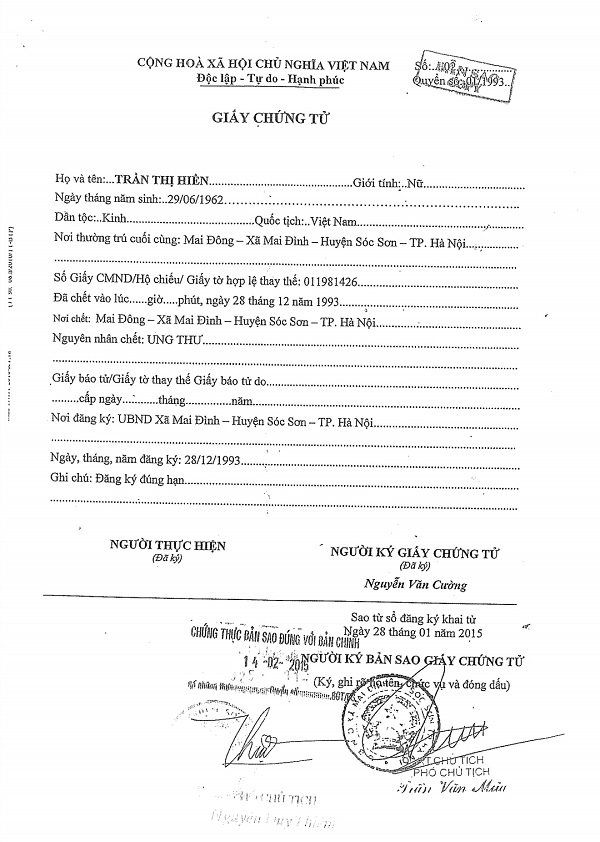 Đó là trường hợp gia đình bà Trần Thị Hiền, SN 1962, tại thôn Song Mai Đông, xã Mai Đình, huyện Sóc Sơn, TP Hà Nội. Trong vụ việc này, sau khi các đối tượng lừa được chồng bà Hiền (ông Đỗ Văn Tuyên) ký vào hợp đồng chuyển nhượng nhà đất, ngay sau đó, các đối tượng đã làm Giấy chứng tử bà Hiền, đồng thời cũng làm Giấy xác nhận tình trạng hôn nhân giả cho ông Đỗ Văn Tuyên với nội dung “Từ khi bà Hiền chết năm 1993, ông Tuyên không kết hôn với ai”.
